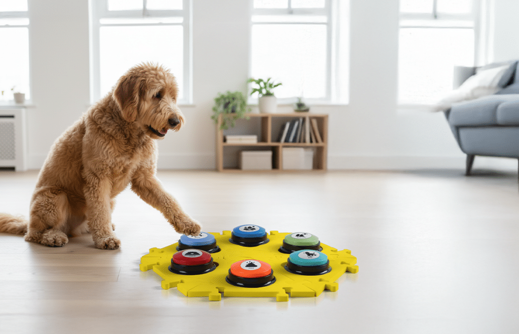 Use positive reinforcement, patience, and play to help your dog express their needs, one word at a time.